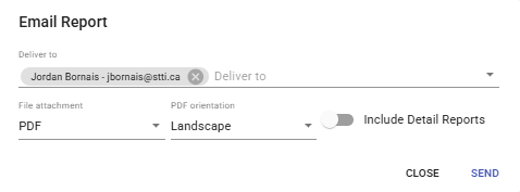 Enter the email address for the person that you want the report sent to. Select the file format you would like the report (PDF or PDF & CSV), how you want the PDF to be orientated (Landscape or Portrait) and if you would like to include the details on the report. Once satisfied the Send button to send the email.