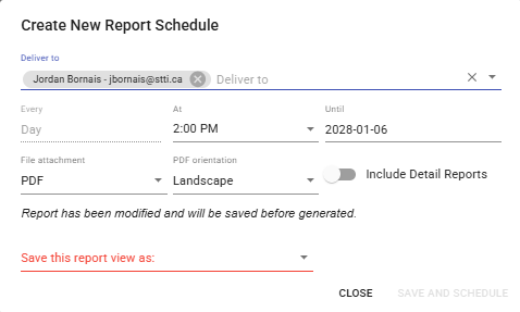 Select the file format you would like the report (PDF or PDF & CSV), how you want the PDF to be orientated (Landscape or Portrait) and if you would like to include the details on the report. Once satisfied click Schedule button at the bottom to create the report schedule.