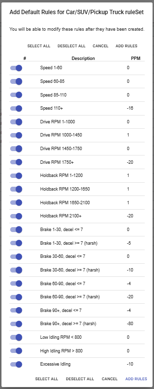 A set of engine data parameters that are tested against while a driver operates a vehicle. These parameters, or rules, are given a point value that when added up provide the driver with a scorecard for the day. These rules include a name, description, the rule itself, and a grace period (a time in seconds before the rule is triggered).